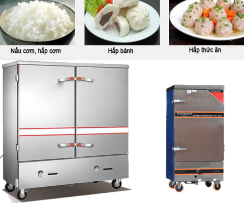 Tủ cơm công nghiệp có thể hấp nhiều loại thực phẩm như: cơm, xôi, giò chả, các loại bánh, hải sản….