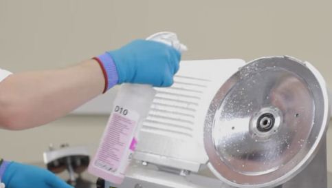 Bạn nên tháo bỏ lưỡi dao, sau đó xịt trực tiếp dung dịch nước rửa chén pha loãng để khử mùi hôi, đồng thời loại bỏ sạch các vết bẩn sót lại bám trên lưỡi dao cũng như các bộ phận tiếp xúc trực tiếp với thực phẩm. Rửa sạch lại bằng nước, sau đó dùng giẻ sạch lau khô và để ráo. Lắp các chi tiết lại như cũ và bắt đầu tiến hành cắt thịt chín để đảm bảo an toàn thực phẩm.